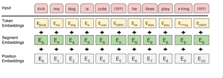 버트의 입출력 표현은 1) Token embedding 2) Segment embedding 3) Position embedding 의 합으로 구성