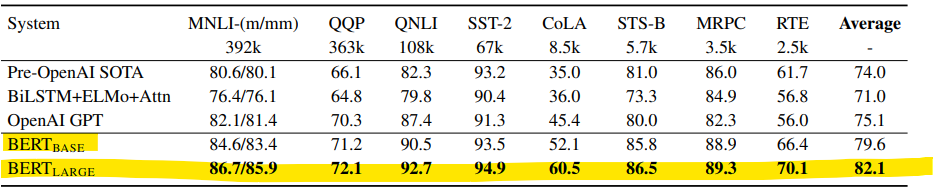- BERT Base: 실무 적용, 빠른 실험, 저사양 환경 ( L =12, H=768, A=12 / total parameter = 110M)