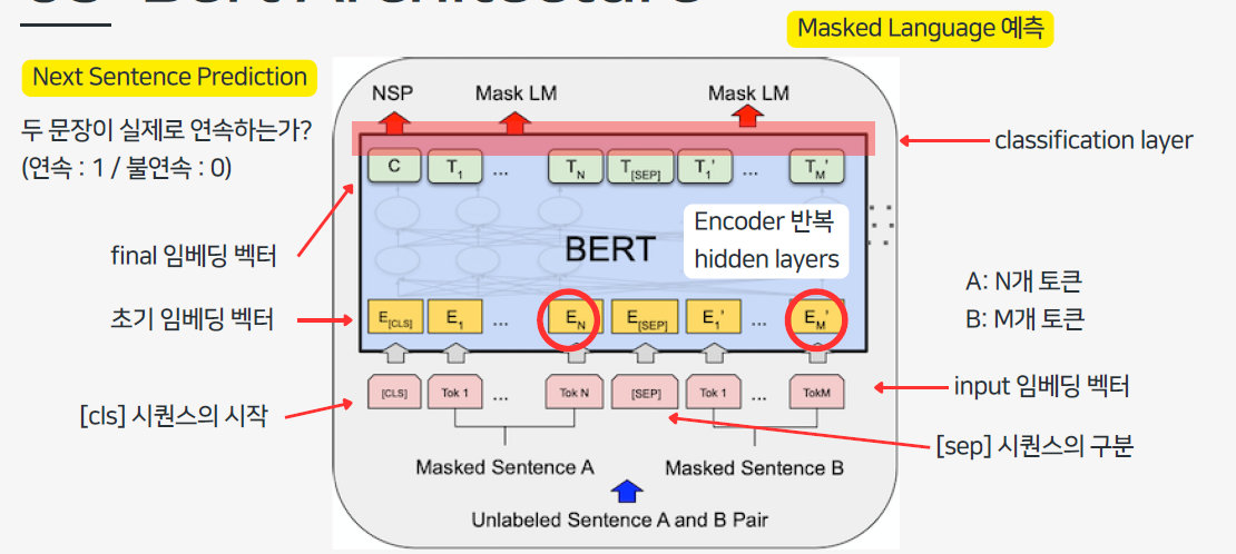 → 여기서 C는 Next Sentence Prediction (NSP)을 수행하는 데 사용되며 문장의 연속성 여부를 이진분류(0/1)로 수행함.