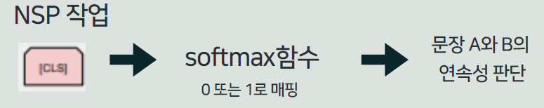 BERT에 두 문장(A와 B)이 입력된 경우 [CLS]는 이 두 문장의 관계나 의미를 요약하는 벡터로 표현되는데, NSP 작업에서는 [CLS] 벡터를 softmax함수로 0 또는 1로 매핑하여 문장 A와 B가 연속된 문장인지 (C = 1) 또는 무작위로 연결된 문장인지 (C = 0)를 예측한다.